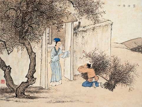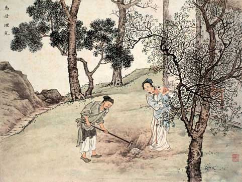 | 24孝图文  01 孝感动天 舜 传说中的远古帝王,五帝之一,姓姚,名重华,号有虞氏,史称虞舜。相传他的父亲瞽叟及继母、异母弟象,多次想害死他:让舜修补谷仓仓顶时,从谷仓下纵火,舜手持两个斗笠跳下逃脱;让舜掘井时,瞽叟与象却下土填井,舜掘地道逃脱。事后舜毫不嫉恨,仍对父亲恭顺,对弟弟慈爱。他的孝行感动了天帝。舜在厉山耕种,大象替他耕地,鸟代他锄草。帝尧听说舜非常孝顺,有处理政事的才干,把两个女儿娥皇和女英嫁给他;经过多年观察和考验,选定舜做他的继承人。舜登天子位后,去看望父亲,仍然恭恭敬敬,并封象为诸侯。  02 亲尝汤药 汉文帝刘恒 汉高祖第三子,为薄太后所生。高后八年(前180)即帝位。他以仁孝之名,闻于天下,侍奉母亲从不懈怠。母亲卧病三年,他常常目不交睫,衣不解带;母亲所服的汤药,他亲口尝过后才放心让母亲服用。他在位24年,重德治,兴礼仪,注意发展农业,使西汉社会稳定,人丁兴旺,经济得到恢复和发展,他与汉景帝的统治时期被誉为“文景之治”。  03 啮指痛心 曾参 字子舆,春秋时期鲁国人,孔子的得意弟子,世称“曾子”,以孝著称。少年时家贫,常入山打柴。一天,家里来了客人,母亲不知所措,就用牙咬自己的手指。曾参忽然觉得心疼,知道母亲在呼唤自己,便背着柴迅速返回家中,跪问缘故。母亲说:“有客人忽然到来,我咬手指盼你回来。”曾参于是接见客人,以礼相待。曾参学识渊博,曾提出“吾日三省吾身”(《论语·学而》)的修养方法,相传他著述有《大学》、《孝经》等儒家经典,后世儒家尊他为“宗圣”。  04 百里负米 仲由 字子路、季路,春秋时期鲁国人,孔子的得意弟子,性格直率勇敢,十分孝顺。早年家中贫穷,自己常常采野菜做饭食,却从百里之外负米回家侍奉双亲。父母死后,他做了大官,奉命到楚国去,随从的车马有百乘之众,所积的粮食有万钟之多。坐在垒叠的锦褥上,吃着丰盛的筵席,他常常怀念双亲,慨叹说:“即使我想吃野菜,为父母亲去负米,哪里能够再得呢?”孔子赞扬说:“你侍奉父母,可以说是生时尽力,死后思念哪!”(《孔子家语·致思》)  05 芦衣顺母 闵损,字子骞,春秋时期鲁国人,孔子的弟子,在孔门中以德行与颜渊并称。孔子曾赞扬他说:“孝哉,闵子骞!”(《论语·先进》)。他生母早死,父亲娶了后妻,又生了两个儿子。继母经常虐待他,冬天,两个弟弟穿着用棉花做的冬衣,却给他穿用芦花做的“棉衣”。一天,父亲出门,闵损牵车时因寒冷打颤,将绳子掉落地上,遭到父亲的斥责和鞭打,芦花随着打破的衣缝飞了出来,父亲方知闵损受到虐待。父亲返回家,要休逐后妻。闵损跪求父亲饶恕继母,说:“留下母亲只是我一个人受冷,休了母亲三个孩子都要挨冻。”父亲十分感动,就依了他。继母听说,悔恨知错,从此对待他如亲子。  06 鹿乳奉亲 郯子 春秋时期人。父母年老,患眼疾,需饮鹿乳疗治。他便披鹿皮进入深山,钻进鹿群中,挤取鹿乳,供奉双亲。一次取乳时,看见猎人正要射杀一只麂鹿,郯子急忙掀起鹿皮现身走出,将挤取鹿乳为双亲医病的实情告知猎人,猎人敬他孝顺,以鹿乳相赠,护送他出山。  07 戏彩娱亲 老莱子 春秋时期楚国隐士,为躲避世乱,自耕于蒙山南麓。他孝顺父母,尽拣美味供奉双亲,70岁尚不言老,常穿着五色彩衣,手持拨浪鼓如小孩子般戏耍,以博父母开怀。一次为双亲送水,进屋时跌了一跤,他怕父母伤心,索性躺在地上学小孩子哭,二老大笑。  08 卖身葬父 董永 相传为东汉时期千乘(今山东高青县北)人,少年丧母,因避兵乱迁居安陆(今属湖北)。其后父亲亡故,董永卖身至一富家为奴,换取丧葬费用。上工路上,于槐荫下遇一女子,自言无家可归,二人结为夫妇。女子以一月时间织成三百匹锦缎,为董永抵债赎身,返家途中,行至槐荫,女子告诉董永:自己是天帝之女,奉命帮助董永还债。言毕凌空而去。因此,槐荫改名为孝感。  09 刻木事亲 丁兰 相传为东汉时期河内(今河南黄河北)人,幼年父母双亡,他经常思念父母的养育之恩,于是用木头刻成双亲的雕像,事之如生,凡事均和木像商议,每日三餐敬过双亲后自己方才食用,出门前一定禀告,回家后一定面见,从不懈怠。久之,其妻对木像便不太恭敬了,竟好奇地用针刺木像的手指,而木像的手指居然有血流出。丁兰回家见木像眼中垂泪,问知实情,遂将妻子休弃。  10 行佣供母 江革 东汉时齐国临淄人,少年丧父,侍奉母亲极为孝顺。战乱中,江革背着母亲逃难,几次遇到匪盗,贼人欲杀死他,江革哭告:老母年迈,无人奉养,贼人见他孝顺,不忍杀他。后来,他迁居江苏下邳,做雇工供养母亲,自己贫穷赤脚,而母亲所需甚丰。明帝时被推举为孝廉,章帝时被推举为贤良方正,任五官中郎将。  11 怀橘遗亲 陆绩 三国时期吴国吴县华亭(今上海市松江)人,科学家。六岁时,随父亲陆康到九江谒见袁术,袁术拿出橘子招待,陆绩往怀里藏了两个橘子。临行时,橘子滚落地上,袁术嘲笑道:“陆郎来我家作客,走的时候还要怀藏主人的橘子吗?”陆绩回答说:“母亲喜欢吃橘子,我想拿回去送给母亲尝尝。”袁术见他小小年纪就懂得孝顺母亲,十分惊奇。陆绩成年后,博学多识,通晓天文、历算,曾作《浑天图》,注《易经》,撰写《太玄经注》。  12 埋儿奉母 郭巨 晋代隆虑(今河南林县)人,一说河内温县(今河南温县西南)人,原本家道殷实。父亲死后,他把家产分作两份,给了两个弟弟,自己独取